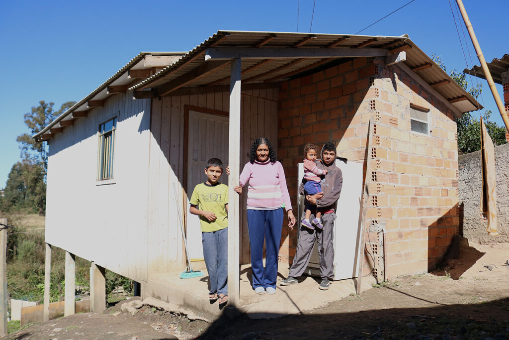Um financiamento de R$ 5,7 mil foi suficiente para a construção de uma casa de madeira onde hoje vivem o filho, a nora e dois netos de Romilda | Foto: Divulgação/Jonatan Costa
