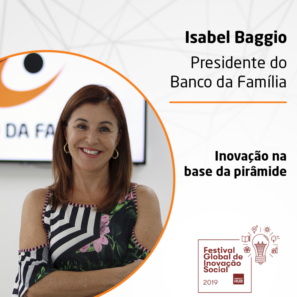 Fundadora e presidente do Banco da Família, maior gerador de desenvolvimento social do Brasil entre instituições de microfinanças (MicroRate), Isabel Baggio está confirmada no Festival Global de Inovação Social do Impact Hub. O evento será no próximo domingo, dia 14, em Florianópolis, e tem como objetivo promover a troca de experiências entre participantes de mais de 100 cidades diferentes pelo mundo.
