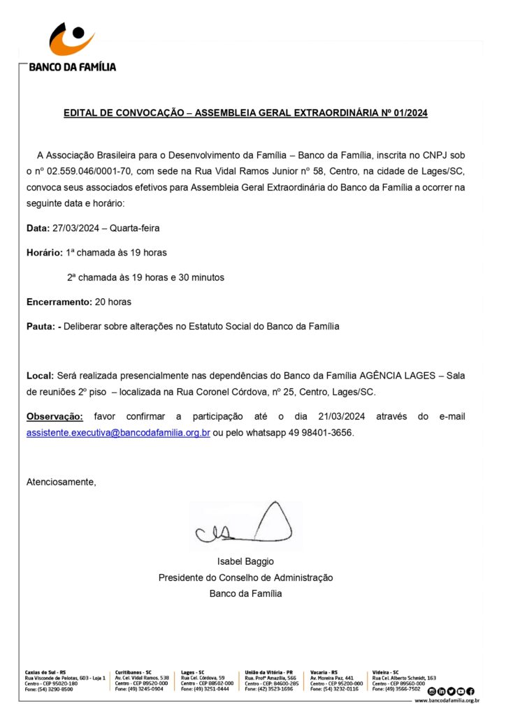 EDITAL DE CONVOCAÇÃO – ASSEMBLEIA GERAL EXTRAORDINÁRIA Nº 01/2024